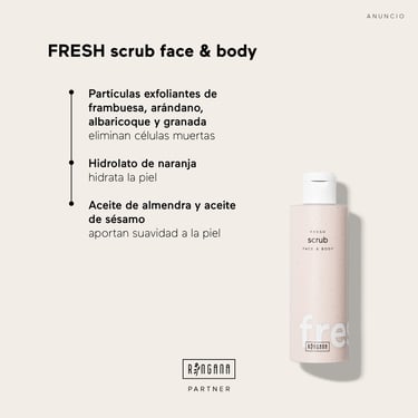 Aplica el exfoliante en la piel humedecida, realizando un masaje suave durante un minuto. El FRESH scrub face & body está indicado como exfoliante para el rostro y el cuerpo.